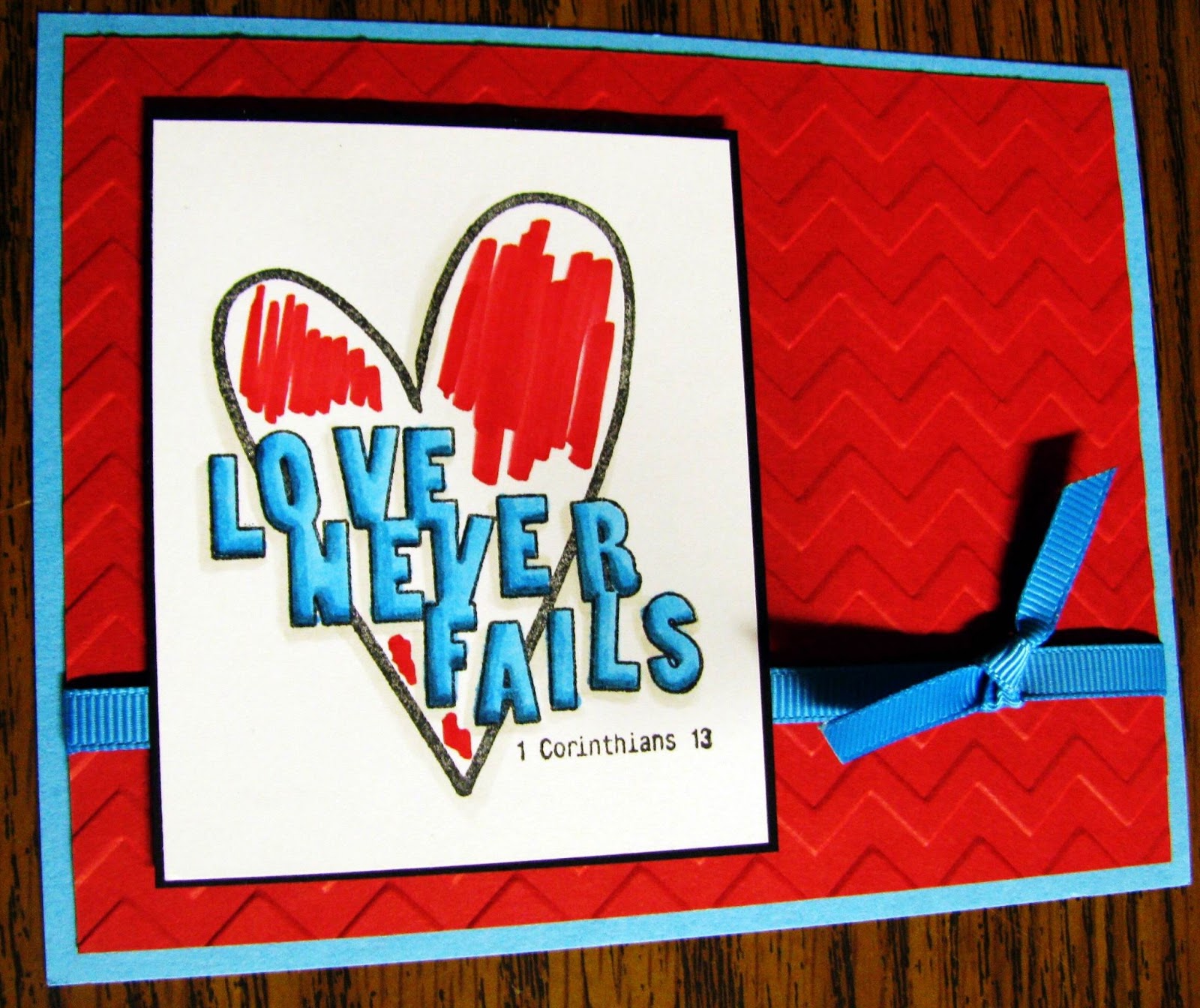 It's time for Valentine's Day cards for the Veteran's Home. I love this Unity stamp, Love Never Fails!